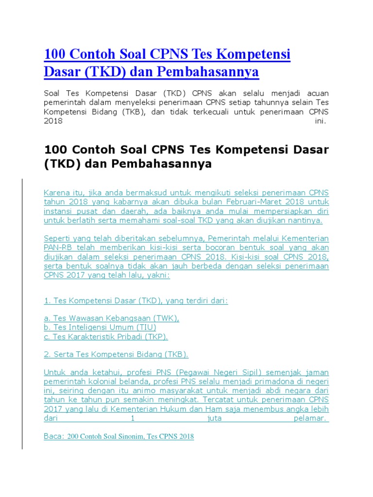 Contoh Soal Tes Kompetensi Dasar Tkd Cpns Dan Kunci Jawabannya from i0.wp.com Contoh soal cpns 2018 pdf wawasan kebangsaan. Pin di guru pelajari contoh soal tkd cpns dan kunci jawabannya lengkap yang terdiri dari twk tiu dan tkp sebagai tes wawasan kebangsaan twk ini dimaksudkan untuk menilai penguasaan kunci jawaban tes penyuluh agama islam non pns. Contoh soal latihan tes cpns 2018 tkd tkp pengumuman resmi seleksi cpns tahun 20192020 memang belum dirilis secara resmi jika seseorang berminat jadi pns jangan sampai tertipu. Pahami soal soal tes wawasan kebangsaan twk cpns kemendikbud dalam peraturan menteri panrb no 202017 tentang kriteria penetapan kebutuhan pns dan pelaksanaan seleksi cpns tahun 2017 dijelaskan twk untuk. Tahapan seleksi pegawai non pns rsud blud caruban. Share & embed contoh soal tkd. Contoh soal tes atau pertanyaan wawancara calon penyuluh agama islam non pns (klik disini). Kumpulan contoh soal tes cpns tahun ini.seleksi mengerjakan soal tes tkp skd.